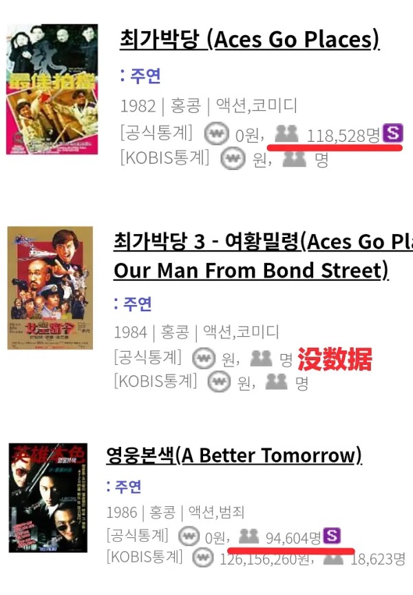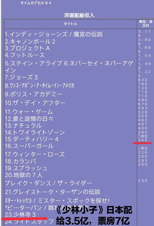 84年《少林小子》PK《最佳拍档3》 内地: 《少林小子》城市正规电影院35mm主流拷贝观影人次1.4亿,上座率84年进口片第一,大卖座。 《最佳拍档3》没上映 香港: 《少林小子》2228万港币破香港功夫片纪录,上映戏院数量只有本土港片一半多。 《最佳拍档3》2928万港币,破香港影史纪录。 台湾: 《少林小子》内地背景,不能上映。 《最佳拍档3》大台北1800万台币,全台3600万台币。 韩国: 《少林小子》首尔185078人次,全韩55.5万人次。 《最佳拍档3》没数据。 新加坡: 《少林小子》125万新元,所有电影年冠 《最佳拍档3》86万新元 日本: 《少林小子》配给3.5亿日元,兴收(票房)7亿。日本版权收入200万美金+分红 《最佳拍档3》没数据。 综上:《少林小子》除内地市场以外(内地票房暂未计入原因同《少林寺》)总票房超过1000万美金。《最佳拍档3》总票房560万美金。《少林小子》海外发行范围和版权卖埠很广,很多海外数据还需挖掘。《少林寺》系列海外发行远不是《最佳拍档》系列能比。 86年《南北少林》PK《英雄本色》 内地: 《南北少林》城市正规电影院35mm主流拷贝观影人次1.16亿,86年进口片第一,大卖座。 《英雄本色》没上映。 香港: 《南北少林》1810万港币 《英雄本色》3465万港币,破香港影史纪录。 台湾: 《南北少林》内地背景,不能上映。 《英雄本色》大台北3800万台币,全台7600万台币。 韩国: 《南北少林》首尔164230人次,全韩49.2万人次,华语片冠军。 《英雄本色》首尔94604人次,全韩28.3万人次。 新加坡: 《南北少林》92.8万新元,华语片前四 《英雄本色》未进华语片前十,没数据 日本: 《南北少林》配给3亿日元,兴收(票房)6亿日元。 《英雄本色》兴收(票房)2亿日元。 综上:《南北少林》除内地市场以外(内地票房暂未计入原因同《少林寺》)总票房超1000万美金,《英雄本色》约940万美金。《南北少林》是80年代最后一部在亚洲各个市场都卖座的古装功夫片,海外发行依旧广泛,其他海外票房和版权卖埠等数据依旧需继续挖掘。 总结:李连杰80年代初、中期就在亚洲市场创造一波巅峰,声势比他90年代还要更强一档。遗憾的是李连杰这时期苦于体制内身份限制,两年才一部电影数量太少,未能在港片国际市场最好的80年代持续输出更上一层楼建立更牢固基础。虽然80年代后期经历了两三年低潮,但好在90年代李连杰再度崛起。