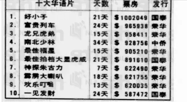 成龙、李连杰、周星驰、周润发全球四大华语票房市场年度卖座前十