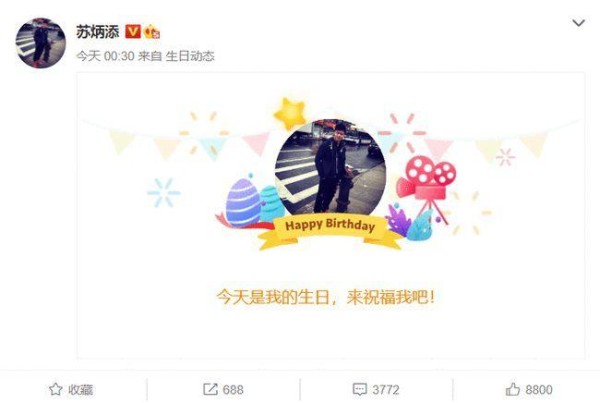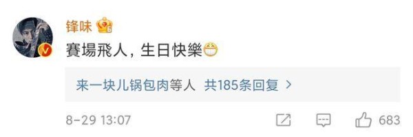 谢霆锋亮相苏炳添生辰微博区,为32岁的“苏神”送上生日寄语道:“赛场飞人,祝你生日快乐”。
