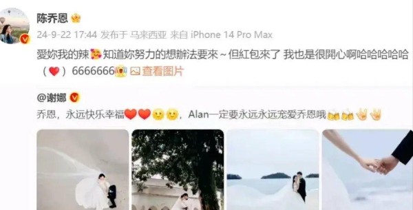 陈乔恩婚礼谢娜送 66666.66 元红包,陈乔恩回应引关注