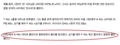 勝利的生日派對連開2天,共邀請了1500餘人參加,其中不乏來自亞洲各地的富商名流。D社獲得了出席勝利派對的所有人員名單,詳細記錄了一行人的吃住行。 勝利將客人分為「VIP」和「普通客人」兩類,來自日本、中國、香港、台灣、新加坡、馬來西亞和泰國等地的財閥或名人則是VIP。被標註為「林太太」(音譯)的女性被安排在「台灣VIP組#1」,她就是後來投資夜店Burning Sun最大的投資商。台灣演員K某被安排在了「台灣VIP組#2」,雖然名單上並未明確標出K某的真實姓名,但D社通過註解表示「K某因涉嫌吸毒震驚華語圈」。明星還有來自新加坡的F某,而他最近則出演了某部Hollywood電影。