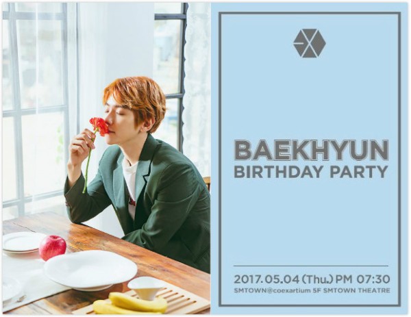 SM娱乐今日(14日)通过SNS公布,将於5月4日韩国时间晚上7时30分,在SMTOWN@coexartium 5楼的 SMTOWN THEATRE举办「BAEKHYUN BIRTHDAY PARTY」,事实上去年以伯贤为开始,部份成员也都陆续举办过生日会。而今年,D.O.、KAI、XIUMIN和世勋均未有公开办生日会,伯贤将是今年首位及连续第二年举办生日会的成员,引起粉丝期待。