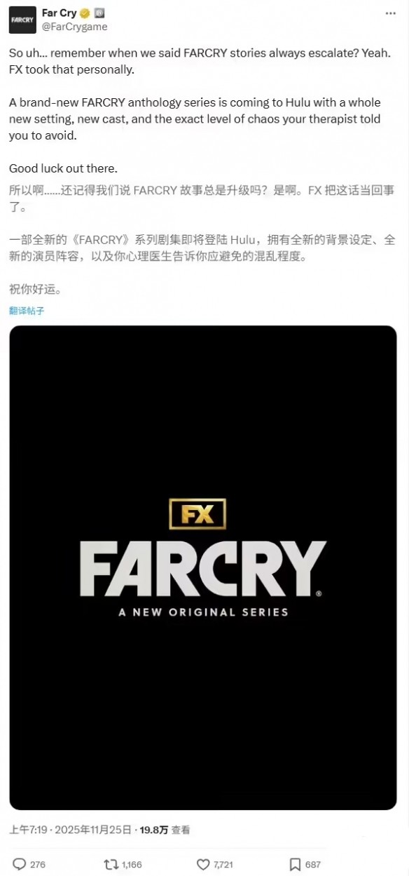 这也是《孤岛惊魂》IP首次以真人剧集形式呈现,此前该系列曾于2008年推出电影改编,X亦在2023年推出了灵感源自《孤岛惊魂3:血龙》的动画作品。