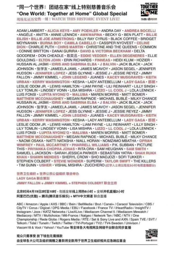 2020同一个世界团结在家慈善音乐会明星嘉宾名单(持续更新…)