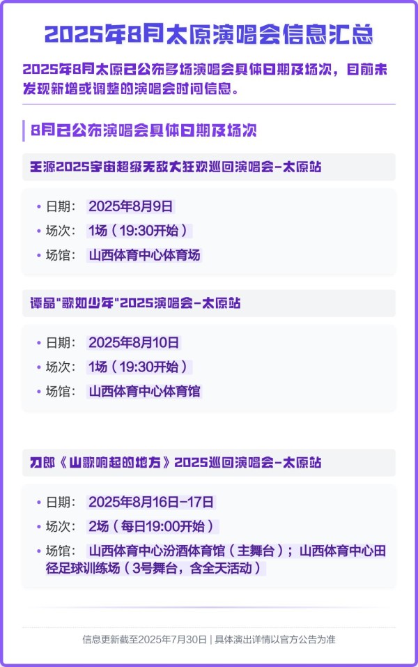 ▎2025年8月太原已公布多场演唱会具体日期及场次,目前未发现新增或调整的演唱会时间信息