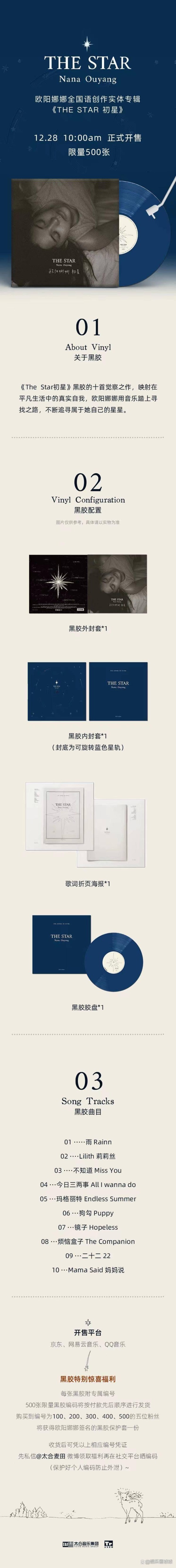 全国语创作专辑《The Star初星》共收录10首歌曲,以声音为载体,触摸美好治愈心灵,透过黑胶挖掘音乐背后的故事。黑胶包含黑胶内外封套、歌词折页海报、黑胶胶盘。黑胶外封套以黑白为主色调,带来更为纯粹的情绪表达,在光与影的黑白中,留下音乐印记。内封套以复古蓝为底色,封底为可旋转蓝色星轨,繁星点点跟随着星轨转动,仿佛刻画了一片星空。歌词折页海报书写欧阳娜娜的满满心意,用音符诉说回忆,将歌词中的情绪传递,黑胶胶盘的蓝白撞色,再现不同“星星”的旋律。