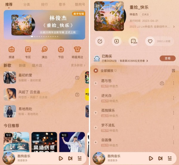除第一时间上线新歌外,酷狗还为歌迷们打造了一系列的专属礼包,包括林俊杰头像挂件、定制专辑皮肤、关注林俊杰抽VIP,还可以抢靓号铭牌赢签名明信片,彰显林俊杰金曲天王身份,也为歌迷打造沉浸式听歌装扮,与歌迷们一起开启这场音乐狂欢,见证“过年”时刻。