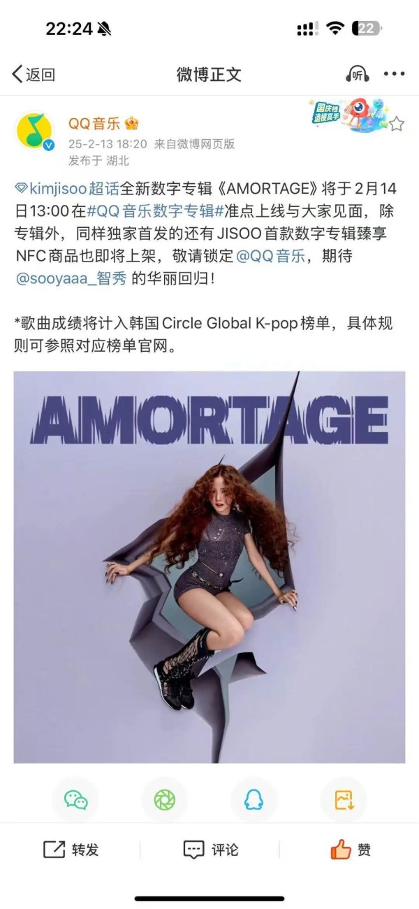 2月13日,QQ音乐官方微博发布消息。韩国著名女歌手JISOO(金智秀)全新数字专辑《AMORTAGE》 将于2月14日13:00在QQ音乐独家首发上线,除此之外,JISOO首款数字专辑臻享NFC商品也即将在QQ音乐上架。JISOO是韩国知名女子组合BLACKPINK成员,《AMORTAGE》是她作为独立歌手发行的首张个人迷你专辑。