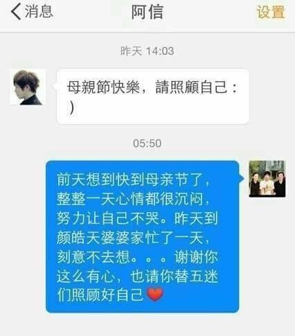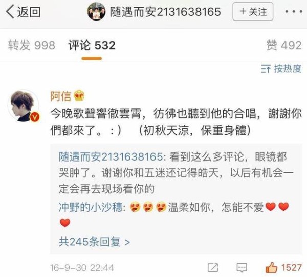 皓天妈妈代替皓天去看了五月天南京演唱会,温暖的主唱大人居然还记得,在皓天妈妈的微博下回复,“今晚歌声响彻云霄,仿佛也听到他的合唱,谢谢你们都来了。”