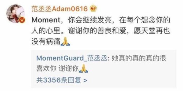 Moment是范丞丞的粉丝,特别温柔和负责,为范丞丞做了很多公益应援。范丞丞知道她去世的消息后,在微博下暖心回复:“你会继续发亮,在每个想念你的人的心里,谢谢你的善良和爱,愿天堂再也没有病痛。”粉丝也一起缅怀,她曾经是丞星,现在变成了天空中最亮的星。