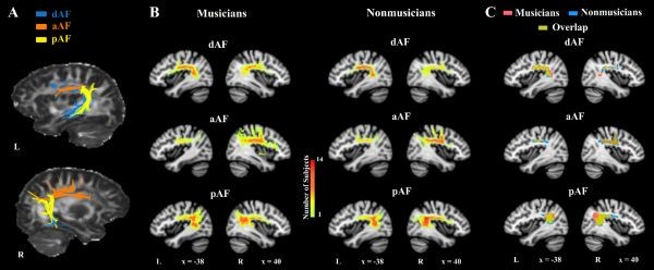 该研究招募了15名年轻音乐家(训练起始年龄≤7岁,训练总时长>10年,每周训练时间>3小时)和15名年轻非音乐家,两组被试的人口学变量(性别、年龄、教育程度),基本的听觉能力和认知能力(听觉工作记忆广度和非言语IQ)进行了匹配。被试在磁共振成像仪中完成不同噪音强度下的音节辨别任务,并采集被试的功能和弥散张量成像。采用确定性纤维束追踪方法获取连接额叶运动皮层(包含布洛卡区和腹侧前运动皮层)和听觉皮层(包含后侧颞上回和颞中回)的弓形束直接通路(dAF),以及由顶叶皮层(包含角回和缘上回)连接听觉和运动区域的间接通路中的弓形束前支(aAF)和后支(pAF)(图4)。各向异性系数(FA)、轴向扩散系数(AD)和纵向扩散系数(RD)同时被分析用于更好地理解由神经元轴突萌发、修剪或重新连接引发的白质纤维束性质的改变,如神经元髓鞘化程度。