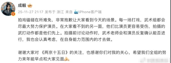 随后,成毅本人针对拍摄《两京十五日》时吊威亚撞到头的事件发文回应,向关心自己的粉丝报平安。他在文中写道:“拍戏磕碰在所难免,非常抱歉让大家看到今天的场景。”同时,成毅也分享了拍摄背后的细节:“拍摄前讨论动作时,武术老师会和演员反复确认能否进行,我也会认真考虑,在自身能力范围内的才去做。”