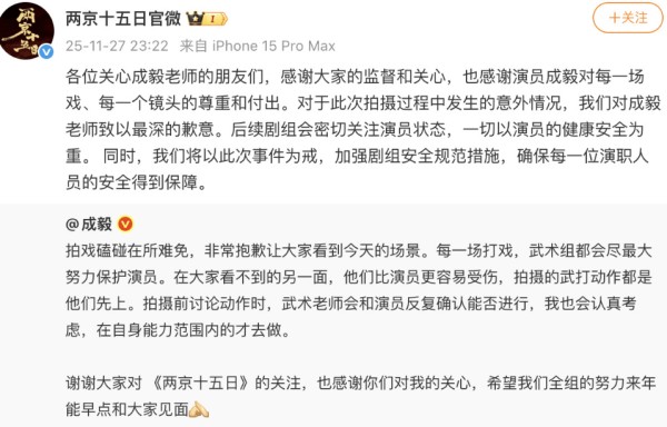 《两京十五日》官方就拍摄意外事件向成毅正式致歉,声明中表示:“对于此次拍摄过程中发生的意外情况,我们对成毅老师致以最深的歉意。后续剧组会密切关注演员状态,一切以演员的健康安全为重。 同时,我们将以此次事件为戒,加强剧组安全规范措施,确保每一位演职人员的安全得到保障。”
