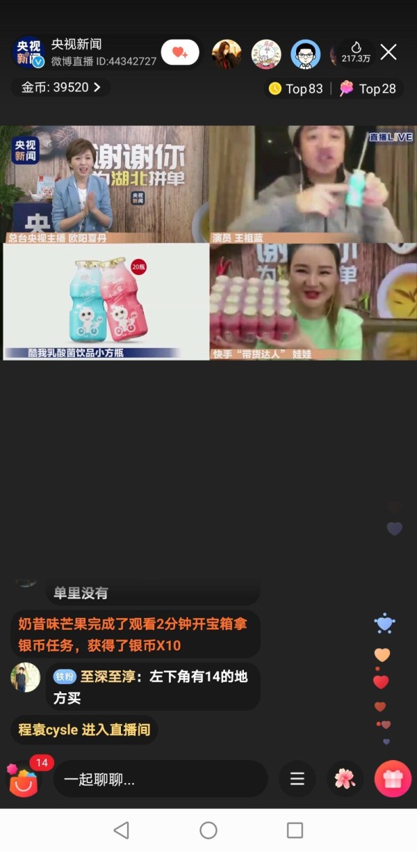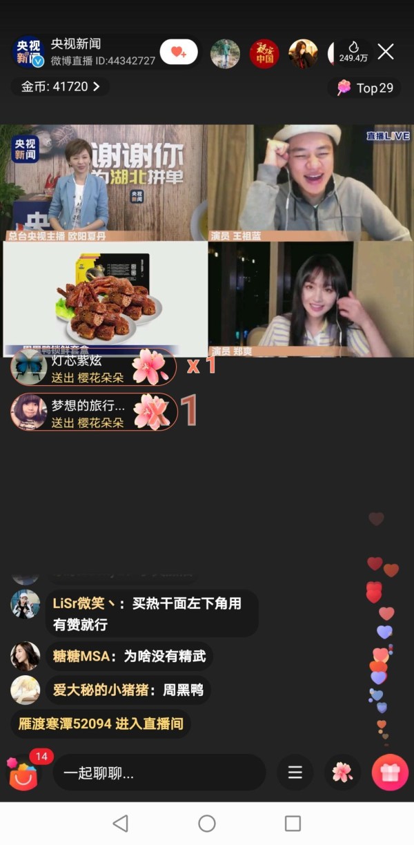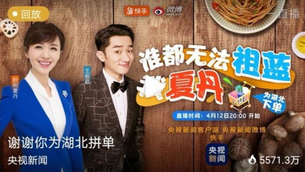 “小朱配琦”成功后,4月12日,央视开启第二场直播带货。央视主持人欧阳夏丹和演员王祖蓝组合,以“谁也无法祖蓝(阻拦)我夏丹(下单)”的谐音,号召网友为湖北拼单。相比“小朱配琦”组合使用大量文化元素,“祖蓝夏丹”的带货方式更接地气,还引入快手主播和其他明星参与。当晚共卖出6100万元湖北产品,刷新了“小朱配琦”为湖北公益直播卖货4000万元的纪录,为疫情期间如何发挥名人的流量效应提供又一案例。