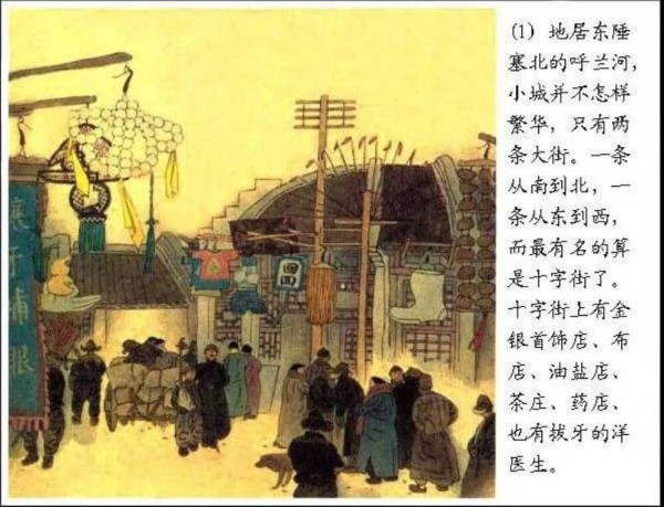 地居东陲塞北的呼兰河,小城并不怎样繁华,只有两条大街。一条从南到北,一条从东到西,而最有名的算是十字街了。十字街上有金银首饰店、布店、油盐店、茶庄、药店、也有拔牙的洋医生。