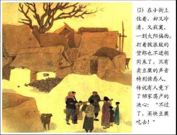 在小街上住着,却又冷清,又寂寞。一到太阳偏西,打着拨浪鼓的货郎也不进胡同来了,只有卖豆腐的声音,特别诱惑人。传说有人竟下了倾家荡产的决心,“不过了,买块豆腐吃去!”