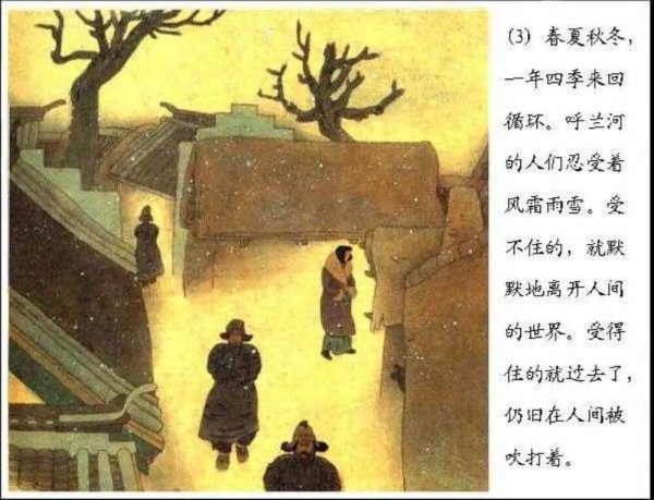 春夏秋冬,一年四季来回循环。呼兰河的人们忍受着风霜雨雪。受不住的,就默默地离开人间的世界。受得住的就过去了,仍旧在人间被吹打着。