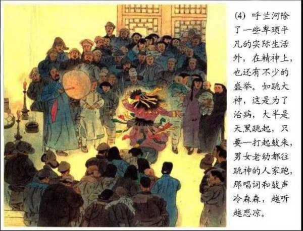 呼兰河除了一些卑琐平凡的实际生活外,在精神上,也还有不少的盛举。如跳大神,这是为了治病,大半是天黑跳起,只要一打起鼓来,男女老幼都往跳神的人家跑,那唱词河鼓声冷森森,越听越悲凉。