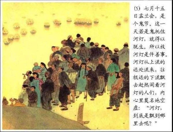 七月十五盂兰会,是个鬼节。这一天若是鬼托住河灯,就得以脱生。所以放河灯是件善事。河灯从上流的远处流来,往极远的下流飘去赶热闹看河灯的人们,内心里莫名地空虚:“河灯,到底是飘到哪里去呢?”