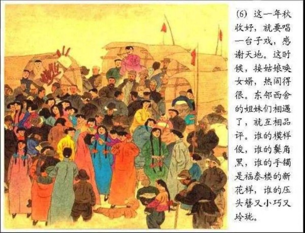 这一年秋收好,就要唱一台子戏,感谢天地。这时候,接姑娘唤女婿,热闹得很。东邻西舍的姐妹们相遇了,就互相品评。谁的模样俊,谁的鬓角黑,谁的手镯是福泰楼的新花样,谁的压头簪又小又巧又玲珑。
