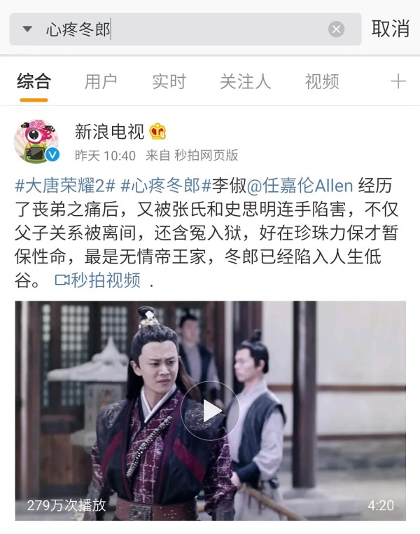第五名,【心疼冬郎】这是最近热播的剧《大唐荣耀》里面的剧情,起到宣传电视剧,增加热度的效果。