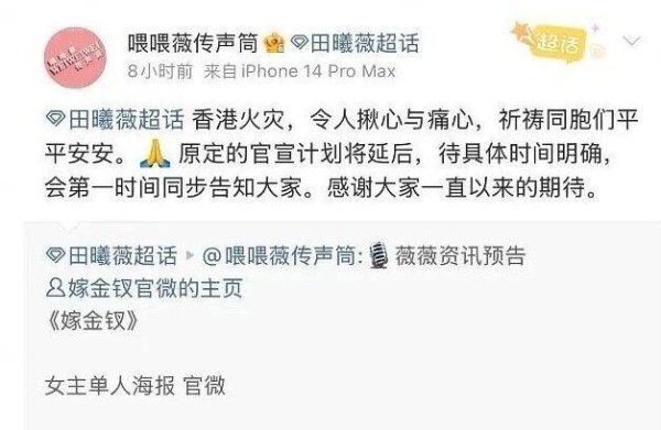 田曦薇把新剧《嫁金钗》的单人海报宣发全延后,承诺 " 哀悼过后再同步 "。
