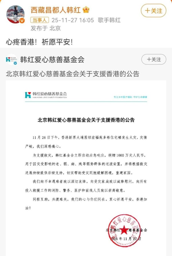 多位明星艺人为香港火灾捐款!韩红周深一马当先,张柏芝捐100万港币