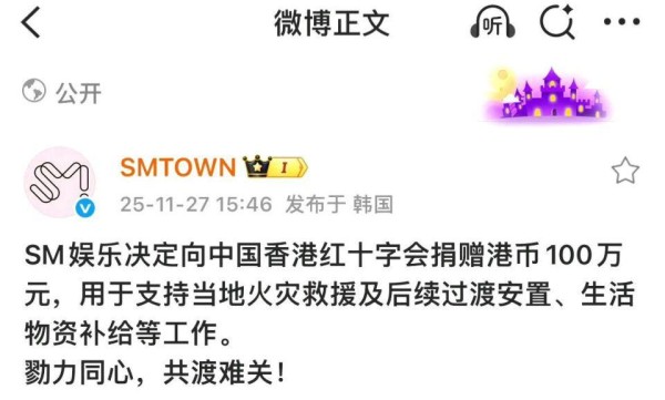 截至 11 月 27 日,娱乐圈的援助还在继续,SM 的捐款引发对其他韩娱公司的效仿呼吁,企业层面小米、腾讯各捐 1000 万港元,阿里巴巴捐 2000 万,安踏捐 3000 万港元物资。这场灾难像一面镜子,照出了娱乐圈的价值观进化:从前大家比流量比数据,如今更比责任比担当。