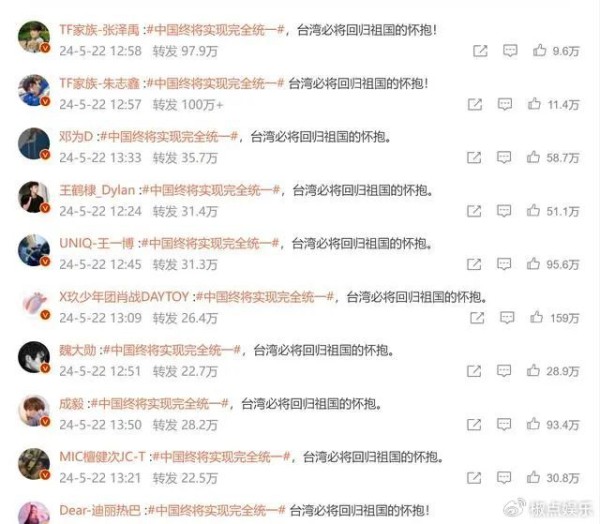 不过在湾湾方面,转发的艺人就屈指可数,但也有三位勇敢的台湾艺人,更是引起了人们的特别关注。他们不仅转发了这张图片,更在社交媒体上用繁体字坚定表示:“台湾必将回归祖国怀抱!”