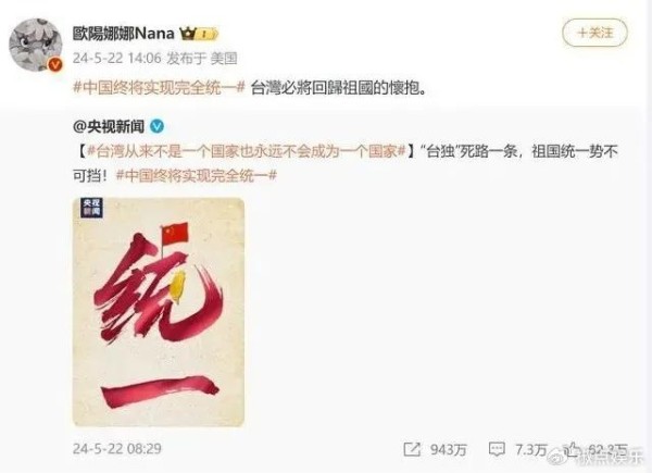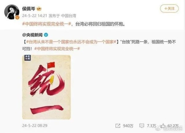 侯佩岑、欧阳娜娜等多位台湾艺人坚定表态,支持祖国统一大业