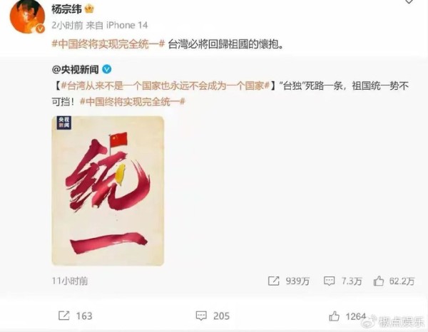 三位来自台湾的艺人欧阳娜、侯佩岑和杨宗纬,用他们的行动向世界宣告:我支持祖国统一!他们勇敢地转发央视图片,坚定地表达出自己的立场,引发了无数网友的热烈反响。