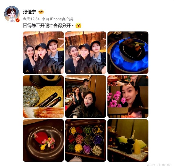 张佳宁也好不到哪儿去,“困得睁不开眼才舍得分开”,怕不是困得睁不开眼才想起发微博吧?