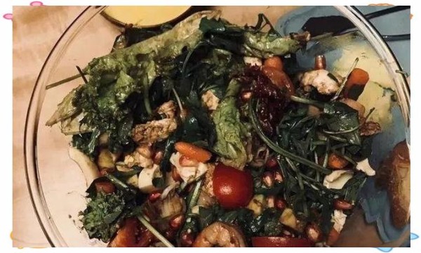 孙俪的午餐,一盘沙拉亮相,其中点缀着生菜、菠菜、小番茄以及虾仁。从色泽上看,似乎加入了酱油等调味料,更似我们熟悉的凉拌菜风格。