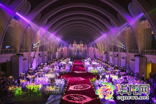仪式现场全景,红毯上用灯光打出“ah”标志 婚礼筹备组供图