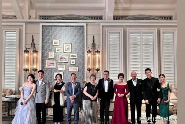 在大合影中,许绍雄夫妇站在C位,许妈妈的银色百褶裙更显高贵典雅,展现出中老年人独特的品味。大明星许绍雄一身正装也十分引人注目。