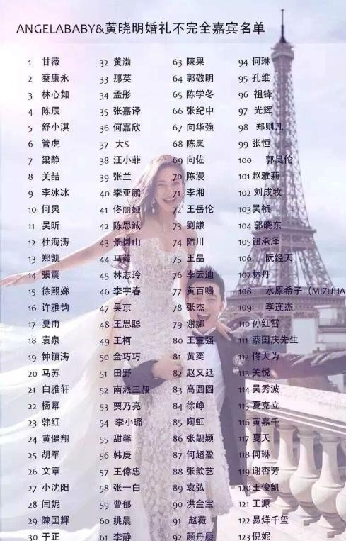 身边也是大咖云集,不知道的还以为是一部新戏杀青了呢,到场的大明星也太多了吧,随后一位知名博主也是爆出了一张baby婚礼的邀请嘉宾图片,上面出现的明星名字也是 一个个都让人不敢相信,看完名单后,网友也表示小说都不敢这么写,这排场才叫世纪婚礼。