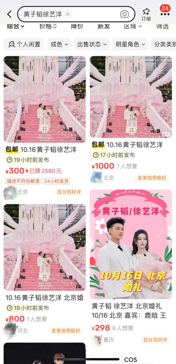 更值得注意的是,这场婚礼本为私人聚会,却因热度催生了“门票诈骗”。二手平台上,标价299至6000元不等的“婚礼门票”被公然售卖,甚至有卖家承诺可与张艺兴、鹿晗合影。10月14日,黄子韬与徐艺洋工作室紧急辟谣,强调婚礼无任何票务渠道。这一插曲反向印证了公众对明星私生活的强烈窥探欲。而黄子韬选择直播,某种程度上正是对这种需求的回应——与其被谣言裹挟,不如主动分享,化被动为主动。