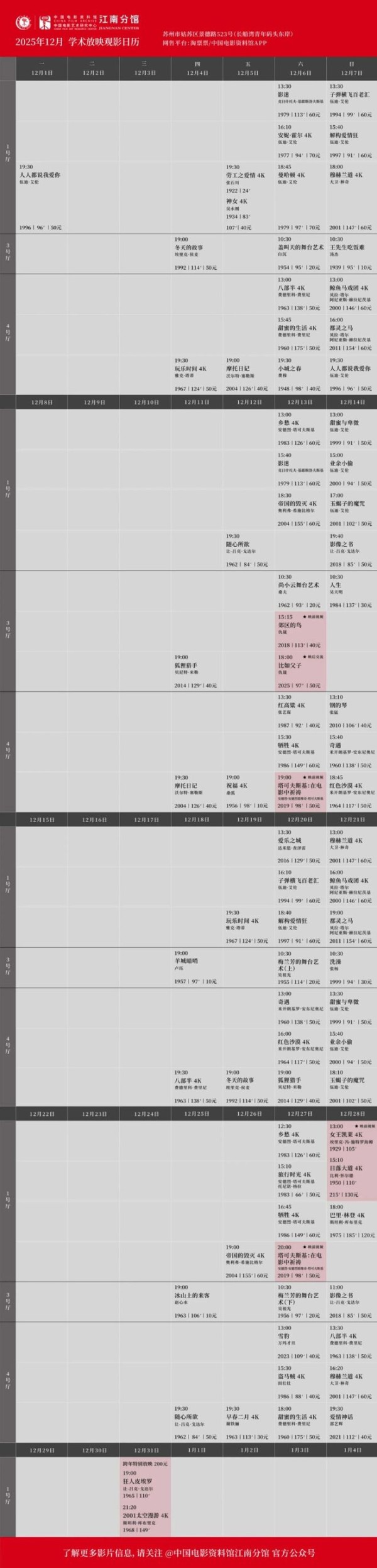 江南分馆2026新年不打烊,元旦假期将正常奉献电影放映;2026年1月精彩片单将于下周公布并开票;另有影迷开放日暨《八部半》放映活动,免费报名已开启。