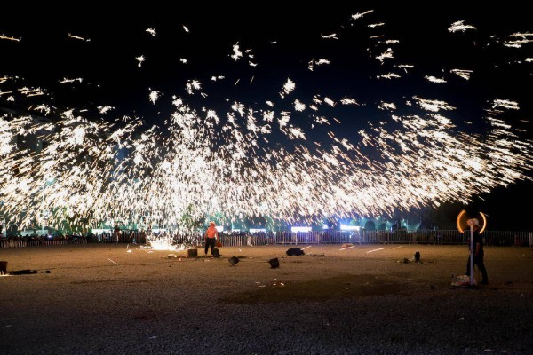 非遗与潮流的碰撞成为当晚最大亮点。千年铁花焰火秀惊艳登场,非遗匠人手持特制工具,将高温铁水挥洒升空,瞬间绽放出漫天星火,火壶秀、风火轮表演相映成趣,金色的火花在夜色中流转飞舞,宛如星河坠落人间,让现场观众沉浸式感受了非遗技艺的震撼与魅力。随后,川剧变脸、吐火表演接续上演,演员灵动的身法、变幻莫测的脸谱和惊险刺激的吐火绝技,引得观众阵阵惊呼,近距离领略了传统戏曲的独特韵味。