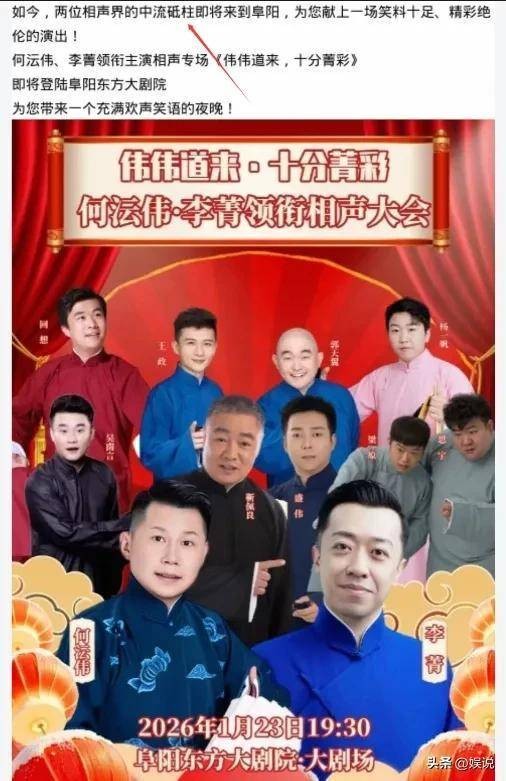 对于相声圈的朋友来说,何云伟和李菁应该都不陌生。两人曾在德云社效力,何云伟是郭德纲的爱徒,深受郭德纲器重,而李菁则是郭德纲的师弟,话语风格独特,在很多经典相声包袱中都有他的身影。2010年德云社发生风波后,两人离开了,原因是他们不喜欢当时的后台氛围。离开后,何云伟和李菁也有过高光时刻,多次亮相北京春晚,成为国家一级演员,并成功加入体制。此次阜阳商演是由中国东方演艺集团主办的。