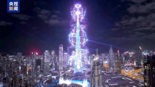 阿联酋迪拜地标性建筑、世界第一高楼哈利法塔呈现了一场精彩的跨年灯光烟花秀。在现场观众的倒计时和欢呼声中,828米的哈利法塔楼体LED屏用多种语言显示出“新年快乐”。