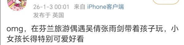 网友芬兰偶遇吴倩张雨剑带孩子 小女孩颜值出众