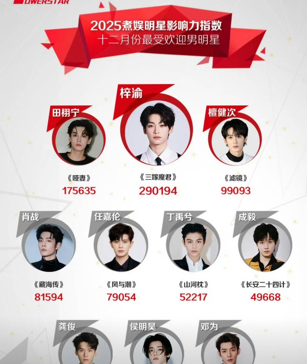 内娱新生代顶流的天花板,被梓渝焊死了!2025年12月“煮娱最受欢迎男明星”榜单新鲜出炉,梓渝毫无悬念拿下TOP1,这已经是他从9月开始连续第四个月稳坐榜首宝座,而且每期都是以断层数据碾压对手,12月更是直接把第二名的热度值甩出快一倍,说一句“断层式领跑”都算是谦虚了。