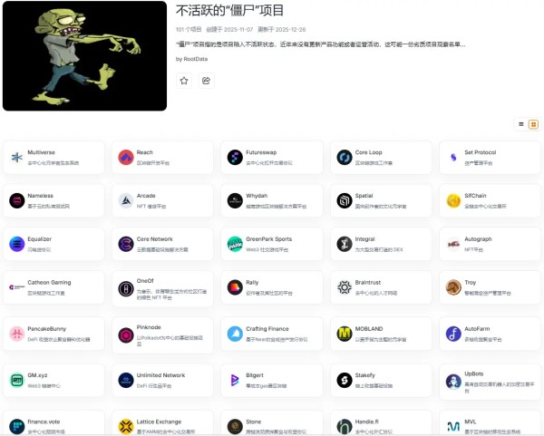 除了显性的死亡名单,RootData 发布的「僵尸项目」合辑曝光了上百个濒临死亡状态的项目,它们大多诞生于 2022-2023 年的周期转换点,虽然未宣告破产,但项目已经陷入不活跃状态,近年来没有更新产品功能或者运营活动。