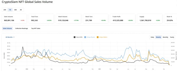 NFT 市场的崩塌则更具警示意义。数据显示,NFT 市场在 12 月跌至年度最低谷,总估值从 1 月份的 92 亿美元暴跌至 25 亿美元,跌幅高达 72%。与此同时,市场活跃度呈现断崖式萎缩,根据 CryptoSlam 数据,卖家数量自 2021 年 4 月以来首次跌破 10 万关口。