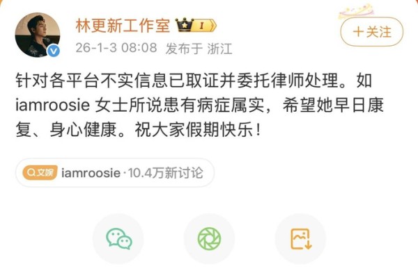 林更新工作室回应 图据林更新工作室微博截图