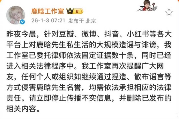 鹿晗工作室回应 图据鹿晗工作室微博截图