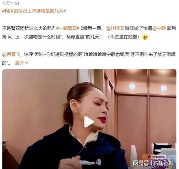柯淳在综艺节目《一路繁花》中自曝“前几天刚接吻”,瞬间引发了观众和嘉宾们的强烈反应。