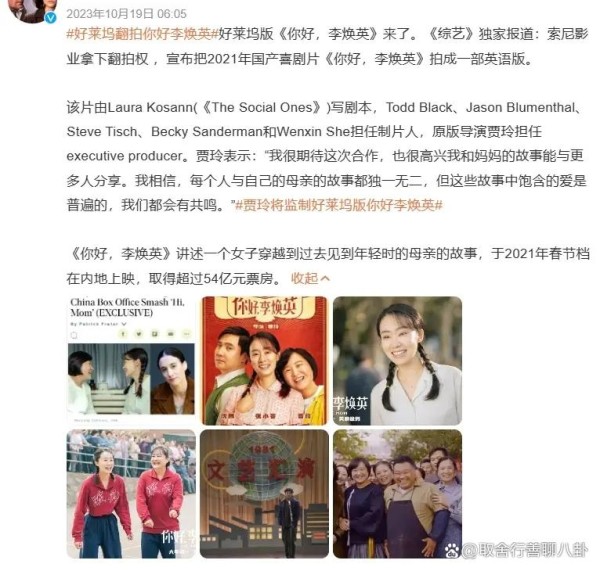 据悉,2023年10月,索尼影业就官宣将翻拍《你好,李焕英》,邀请贾玲担任监制。