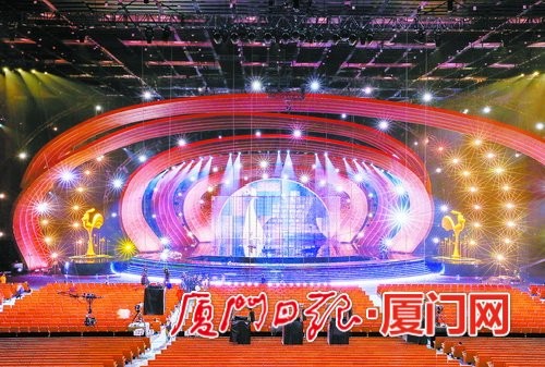 昨晚,工作人员在厦门海峡大剧院调试灯光系统。今晚,第28届中国金鸡百花电影节闭幕式将在此举行。(厦门日报记者 王火炎 摄)